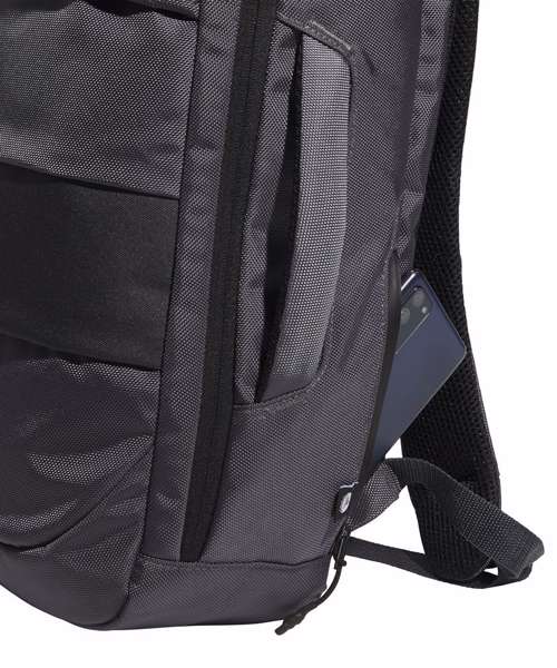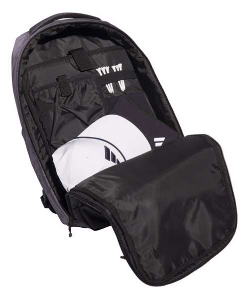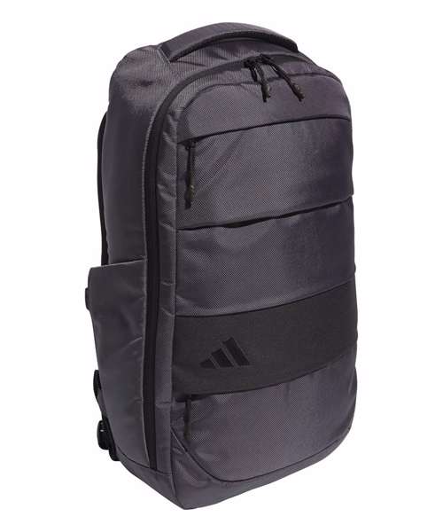 A multipurpose day pack for golfers made in part with recycled materials. Front zip and slip-in side pockets. Laptop sleeve and padded adjustable shoulder straps with chest strap. Top and side carry handles.