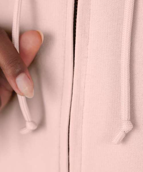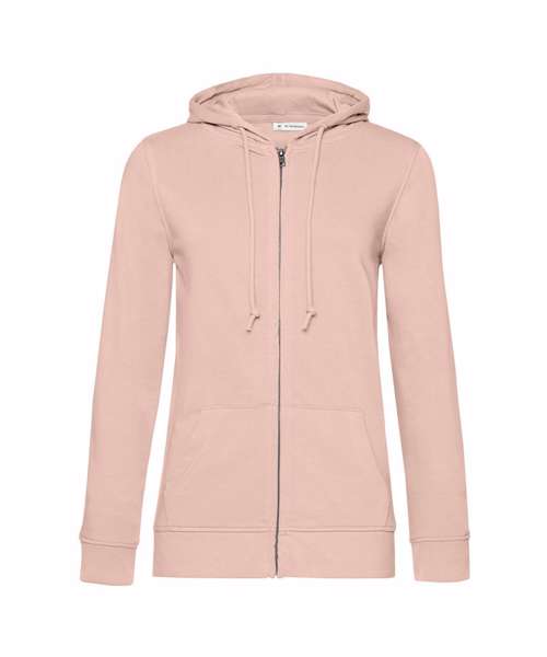 Trendy organic zipped hooded sweatshirt with retail fashion oriented look and feel. Strong styling with great fitting and perfect length. Side seams ensure the best fit and a feminine silhouette. Visible "Hi, I'm Organic" neck tab to highlight the organic value of the garment. Easy branding solution - B&C No Label Solution. Inside single Jersey halfmoon in back to allow easy branding personalisation. Qualitative herringbone neck tape. Retail like features: covered metal zip, single Jersey lined hood, qualitative herringbone neck tape and fashionable drawcord.
