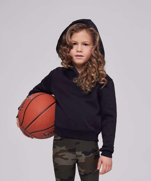 Ideal for cosy hour, the girls cropped sweat hoodie convinces with its balance of typical hoodie details and trendy cropped cut. A hood makes it a comfortable must-have. Wide ribbed cuffs on the sleeves and hem make the perfect look, which can be personalised with prints of your choice. This item is manufactured in a FAMA Certified factory. FAMA stands for Facility and Merchandise Authorisation and is a high standard production certificate.