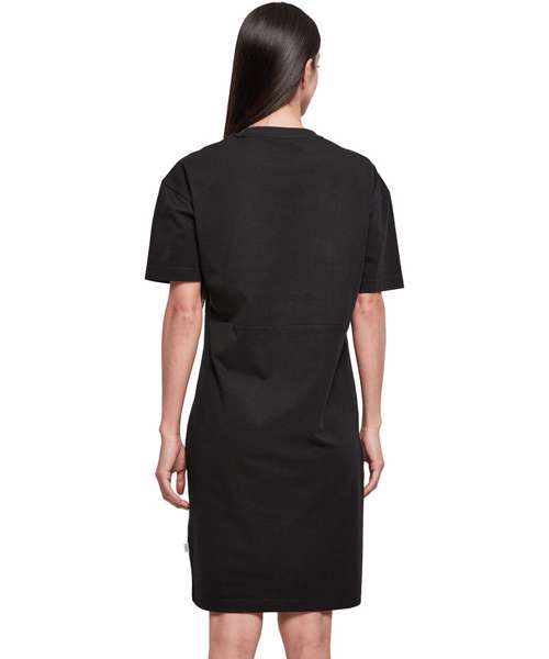 With an urban look, plus an extra touch of casual, this eye-catching dress employs a straight, oversized cut. The upper body area is strongly reminiscent of a relaxed tee and, from the hips, is slit on the right, which heightens both wearer comfort and visual appeal. The dividing seam is at waist level and the shoulders are dropped. The dress can further be refined via embroidery or print options.