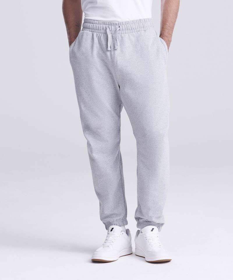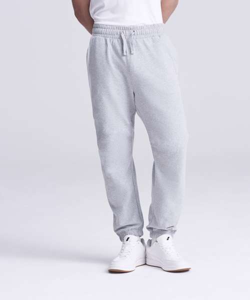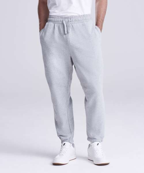 Relaxed unisex fit. 70% recycled cotton. Cuffed leg opening. Elasticated waist with DTM drawcords. Brushed inner fleece. Side pockets. Size tab only, for easy rebranding.