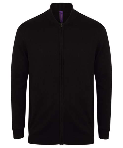 Fine knit, 12 gauge unisex bomber jacket. Semi-fashioned sleeve with full front zip opening. Metal zip and puller. 1x1 neck rib, hem and cuffs. Welted front pockets. Henbury cut-out brand label. Co-ordinates with HB720 product range.