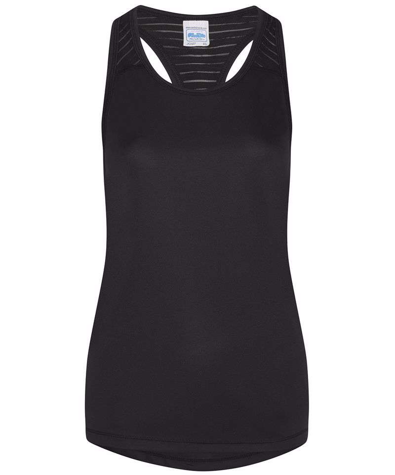 Girlie fit vest with mesh panel and racerback styling. Featuring high performance wicking fabric and dropped hem at back.