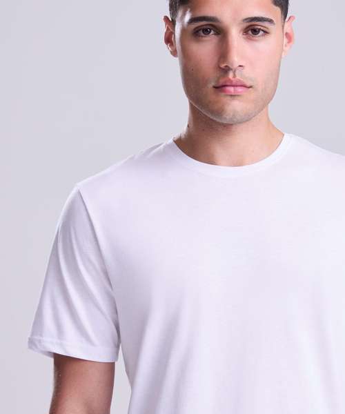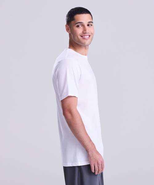 Active fit. Set-in sleeve design. Cotton polyester blended performance fabric. Self-fabric taped back neck. Twin-needle stitching detail. Self-fabric crew neck. Simple tear-out label makes it perfect for rebranding. UPF 40+ TBC. Inherent stretch fabric properties.