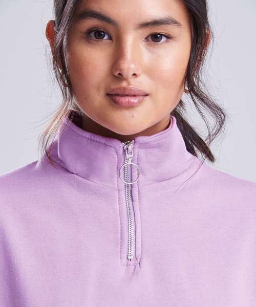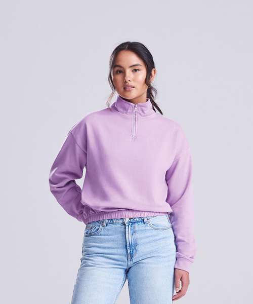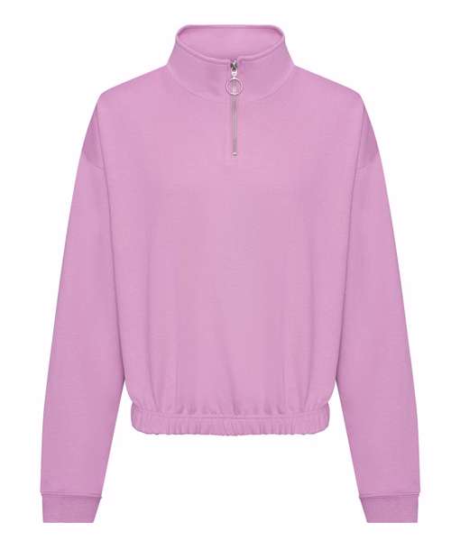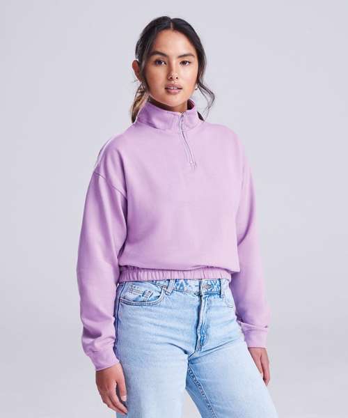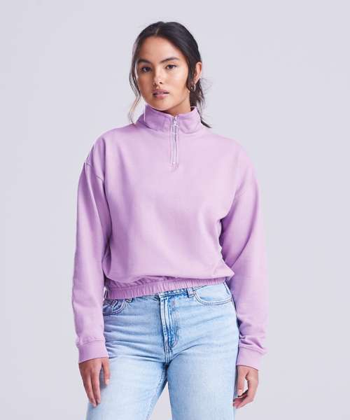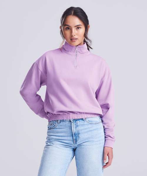 Women's regular fit. Funnel Neck. Quarter zip fastening. Cropped style. Elasticated hem. Brushed Inner fleece. Ribbed cuffs. Soft cotton faced fabric creates ideal printing surface. Simple tear out label makes it perfect for rebranding.
