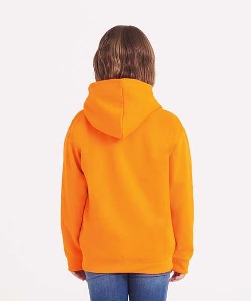 Vibrant eye-catching colours. No drawcord to comply with EU regulation. Twin needle stitching detail. Kangaroo pouch pocket. Ribbed cuff and hem. Simple tear-out label. Brushed inner fleece.