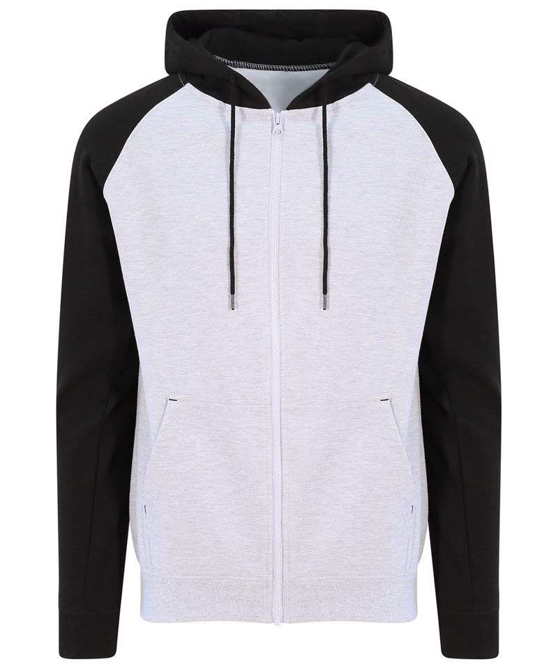 Twin-needle stitching detail. Contrast raglan sleeves. Double fabric hood. YKK plastic zip. Contrast flat lace drawcords. Spilt kangaroo pocket. Ribbed cuffs and hem. Soft cotton faced fabric creates ideal printing surface. Simple tear-out label makes it perfect for rebranding. Brushed inner fleece.