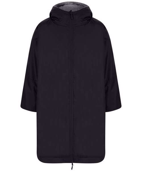 The ultimate team robe is made in a water-resistant fabric with a cosy sherpa fleece lining and three-piece hood. One size fits all, the roomy fit with double-ended full front zip allows wearers to keep warm and get changed underneath the robe. Perfect for wild swimming or wearing on team sidelines. Zipped pockets with fleece lining keep hands warm with multiple inner pockets for keeping belongings safe. Topped off with a large embroidery zip for access to directly decorate.