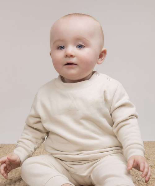 Kids' sweatshirt made in recycled fabric with self-fabric knitted rib at neck and cuffs. Flatlock V stitching detail at the CF neck. YKK popper fastening on the shoulder on sizes 0/6 – 24/36 only. Tag-free.