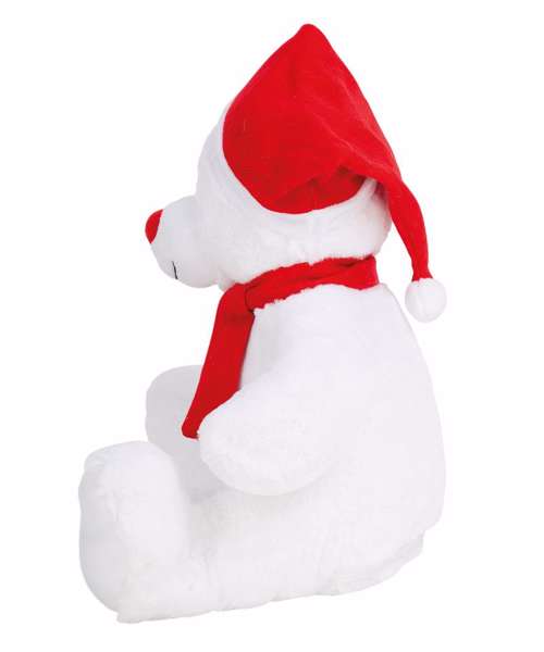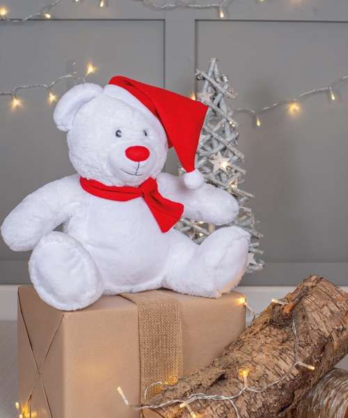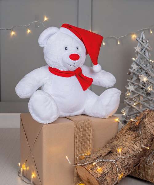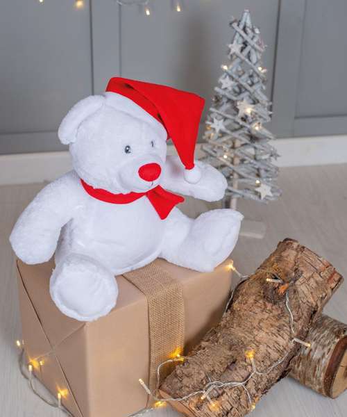 This Christmas bear will brighten up everyone's Christmas with its knitted hat and scarf in red. The front panel can be decorated with embroidery, vinyl or sublimation printing.