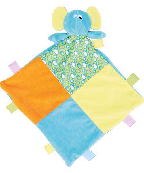 This multi-coloured elephant comforter with internal rattle will be a favourite for any child. It has a bright blanket with patchwork panels and fabric tabs and zip access on the comforter to allow for direct access to print or embroider. Complies with EN71 European Toy Safety regulations. Remove all hang tags and their fasteners before giving these items to a child. Suitable for all ages.