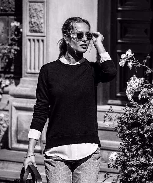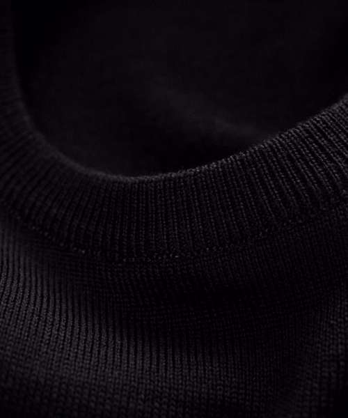 100% Cashwool® merino wool extra-fine (19.5 micron). Great shape retention. Rib at sleeve and bottom hem. Set-in sleeves. Crew neckline.