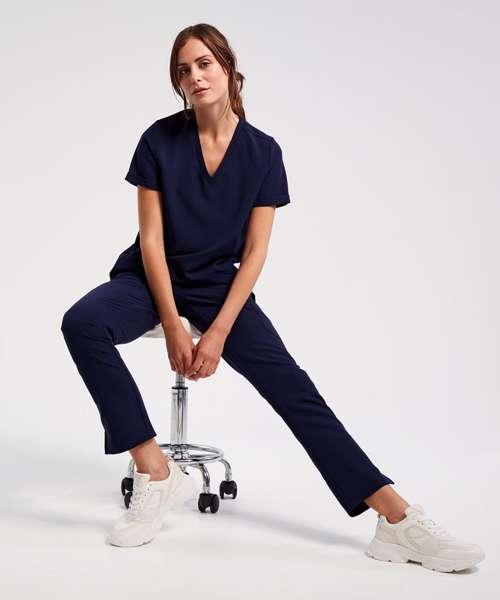 Women’s short sleeve scrub tunic. Comfortable four-way stretch. Breathable, easycare, crease-resistant fabric. V-neck, turn-up sleeves and two front pockets. Back darts, side vents and modern fit. Decorate with embroidery and/or print. Contains certified recycled polyester.