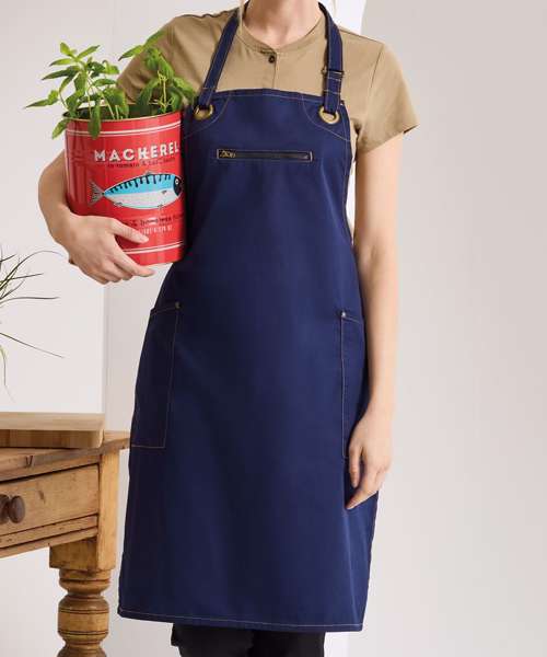 A bib apron, made with a combination of certified recycled polyester and cotton. Featuring two handy side pockets with rivet detail. The centre zip pocket comes away to the underside to allow embroidery applications. Contrast stitching features across this apron and oversized antique brass eyelets give an industrial- chic feel to the design.
