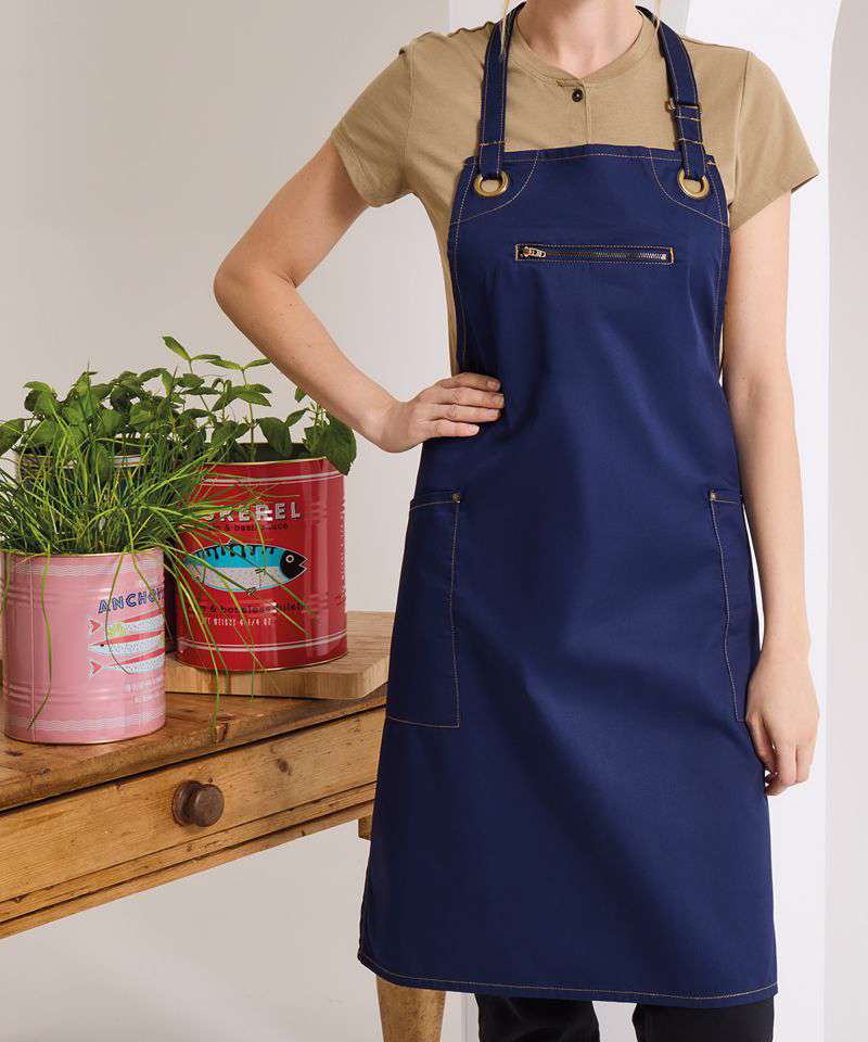 An full bib apron made with a combination of certified recycled polyester cotton. Featuring two handy side pockets with rivet detail. The centre zip pocket comes away to the underside to allow embroidery applications. Contrast stitching features across this apron and oversized antique brass eyelets give an industrial-chic feel to the design. Eyelet and rivet detail. Adjustable antique brass buckle on neckband. Side pockets and centre zipped pocket.