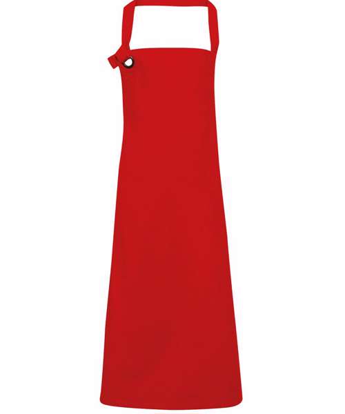 A full bib apron made from heavy cotton canvas fabric for a soft hand feel. Self fabric strap is sewn to the main body of the apron on one side and the wearer ties a knot around the large metal eyelet on the other side to form the neckband. Measuring 86cm long and 72cm wide.