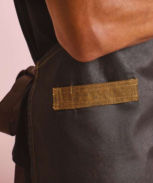 A bib apron with rustic charm for those who want a more vintage approach to their service uniforms. Decorated with contrast fabric features for design and functionality. The faux leather detail really elevates this apron to give it an authentic, luxurious appearance, popular with many establishments.