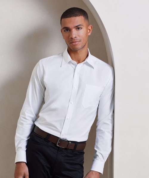 Men's signature Oxford long sleeve shirt with wrinkle free finish for a smart and professional appearance. Button down collar. Left breast open mitred pocket. Long sleeves with button fastened cuffs that will also fit cufflinks. Back pleats. Cotton rich Oxford fabric. Semi fitted styling.