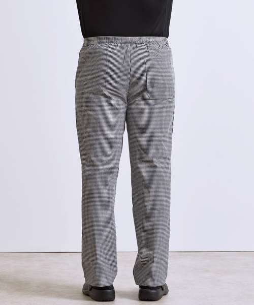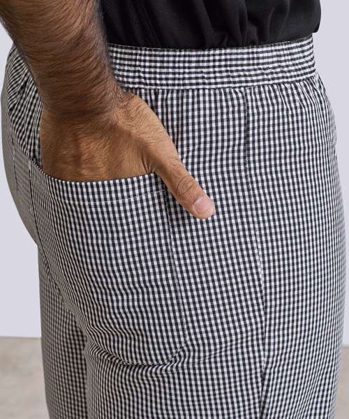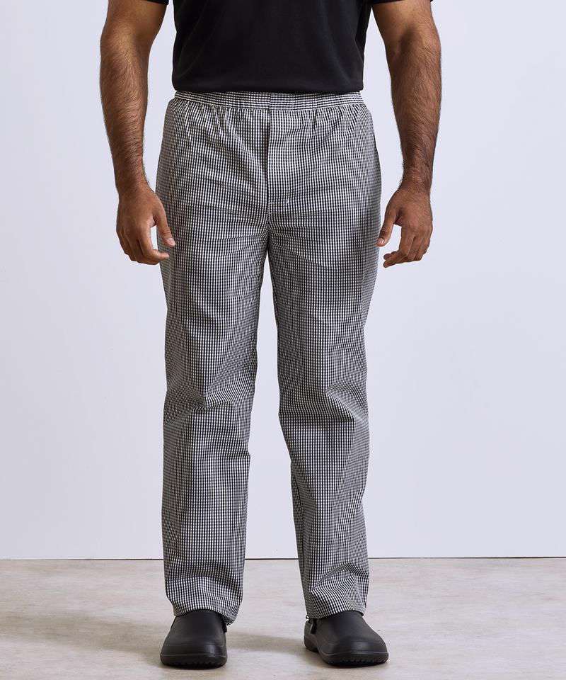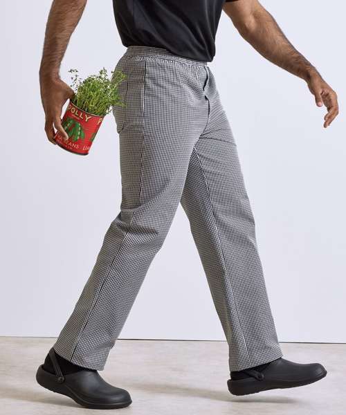 A traditional chef's trouser available in two popular mini-check colourways. An easy-wearing comfortable pull-on style for maximum comfort during long shifts in the kitchen. With an elasticated waist and zip fly and a useful rear patch pocket.