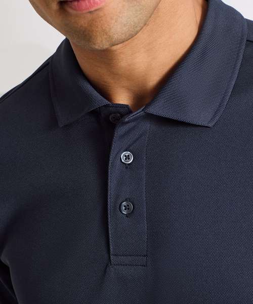 Men’s short sleeve polo shirt made from certified recycled polyester with production method that has a reduced environmental impact for creating spun dyed yarns. Moisture management properties to the fabric guarantee a breathable and wicking performance, so the wearer stays fresh and cool. Styled with a ribbed collar, three-button placket and side vents.