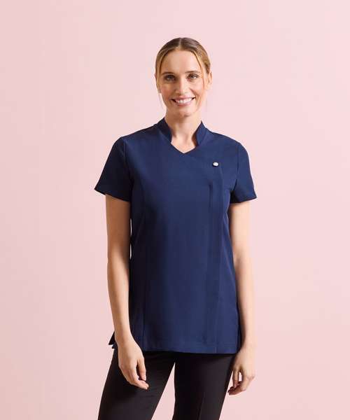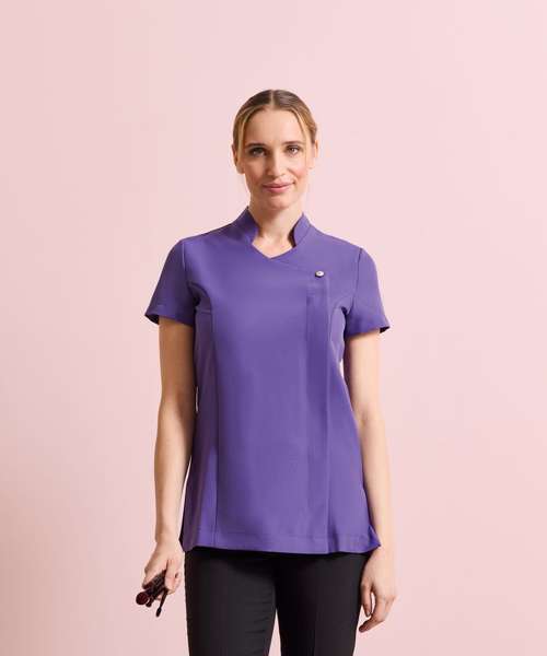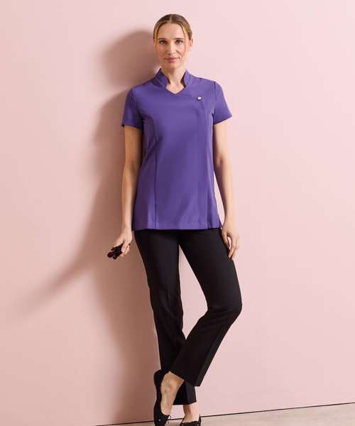 Beauty and spa tunic with feature button front fastening with concealed zip. Mandarin collar. Short sleeve. Princess seams. Side vents. Back pleat for ease of movement. Easycare.