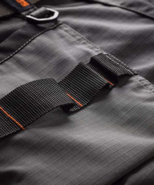 Lightweight ripstop fabric for comfort and performance. Flexible fit with stretch panels for freedom of movement. Canvas pockets and triple-stitched seams for durability. Cargo and mobile phone pocket. Tool loops and D-ring for storage. YKK zip fly. Certified amfori BSCI.