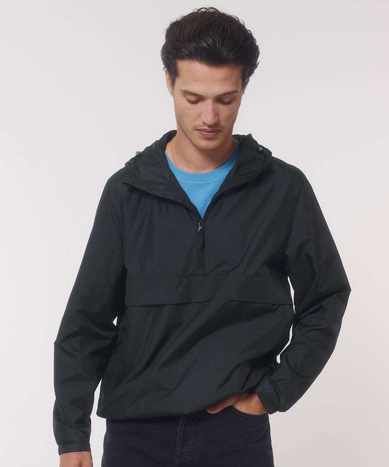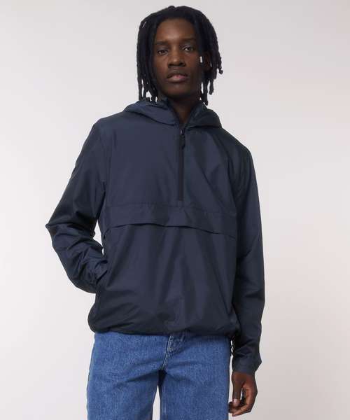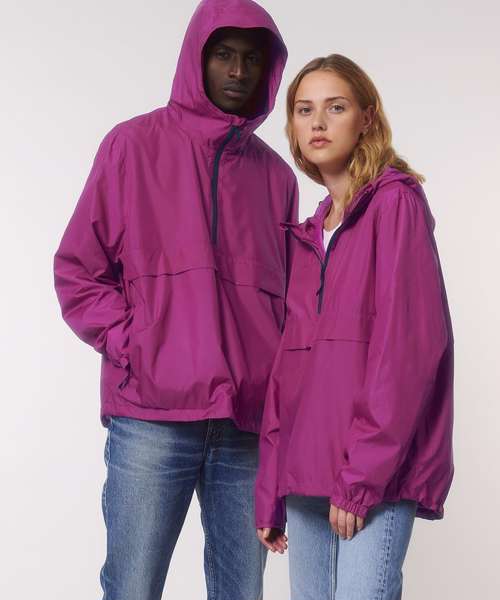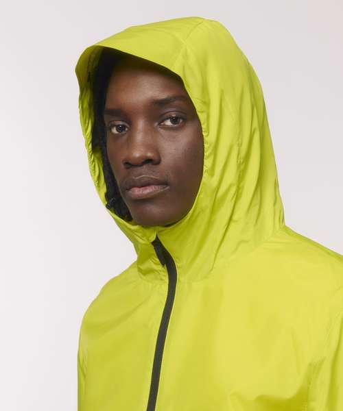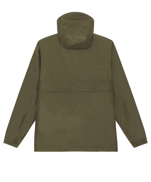 Longer back length with curved hem for protection. Bottom hem and hood with adjustable plastic stopper and elastic cord. Sealed hood visor. Zipped welt pockets. Non-functional flap, front and back. Self-fabric half-moon at back neck. Inside zip opening at bottom hem and inside loop, with snap at armhole providing easy access for chest decoration.