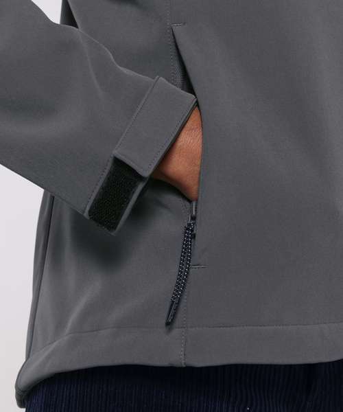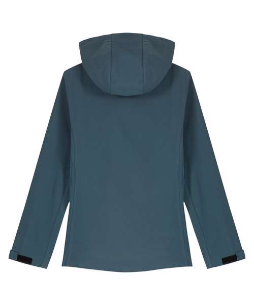 Women’s hooded softshell jacket, medium fit with set-in sleeve, high collar and panelled hood. Hood opening and bottom hem with adjustable plastic stopper and elastic cord. Reverse nylon zip at centre front. Zipped welt pockets with reflective elastic puller. Bonded three-layer fabric with internal membrane. Fully bonded fleece inside layer. Side panels and stretch for better shape. Adjustable hook and loop sleeve opening. Inside seams finished with recycled binding. Water-repellent up to 10,000mm, breathability up to 3000G/M2/24hrs allowing perspiration to escape. Windproof. Bionic ECO DWR (durable, water-repellent) finish.