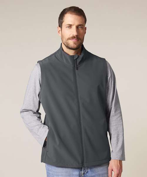 Premium men’s sleeveless softshell jacket. 315gsm stretch fabric with recycled TPU membrane and inside fleece layer. Water-repellent, breathable and windproof.