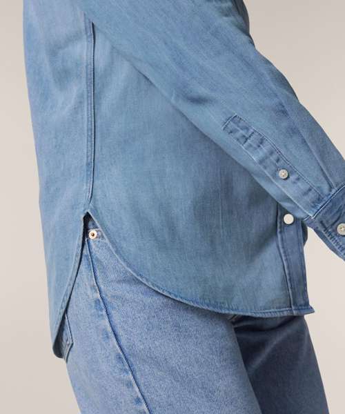 The Stella denim shirt for women. Medium fit. Point collar with single-needle topstitches. Collar stand with one contrast button. Front placket with single-needle topstitches on each side. Forwarded shoulder. Back yoke. Inside yoke in self-fabric. Set-in sleeves. Sleeve placket with one button. Cuff with two buttons. Straight cuff corners. Double pleats at cuff seam. Faded look on all seams due to garment washing – indigo yarn dyed product – so each garment may vary in appearance.