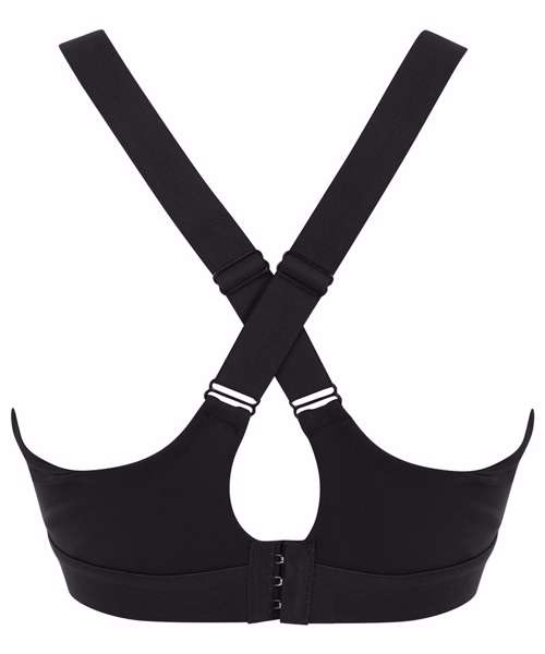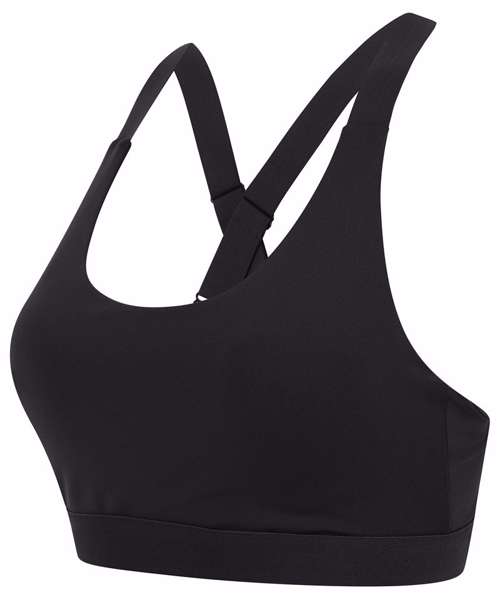Women's core bra with medium impact. Round neckline with cross over elastic strap back. Bra clasp fastening. Permanent cups, non removeable. Tear-out label.