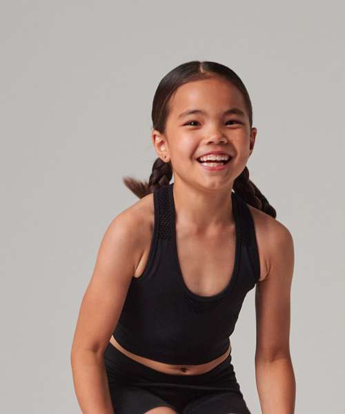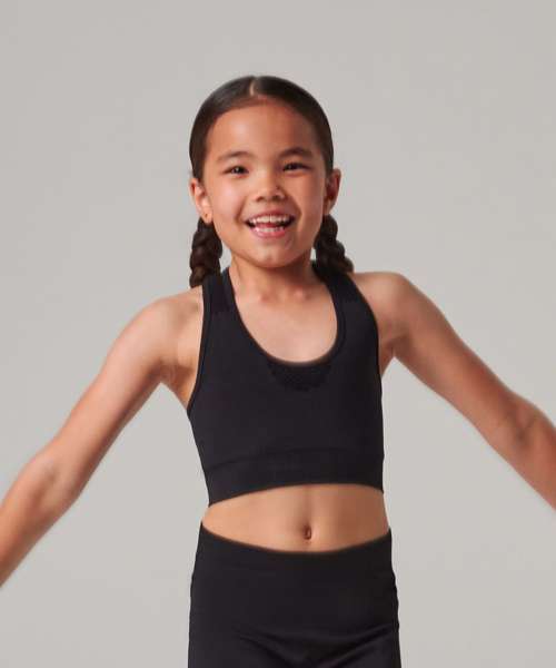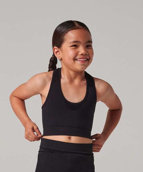 The kids' seamless crop top is the mini-version of our ever-popular women's style. This active crop top features a seamless knit for comfort and the self-fabric mesh helps to keep you cool and on-trend.