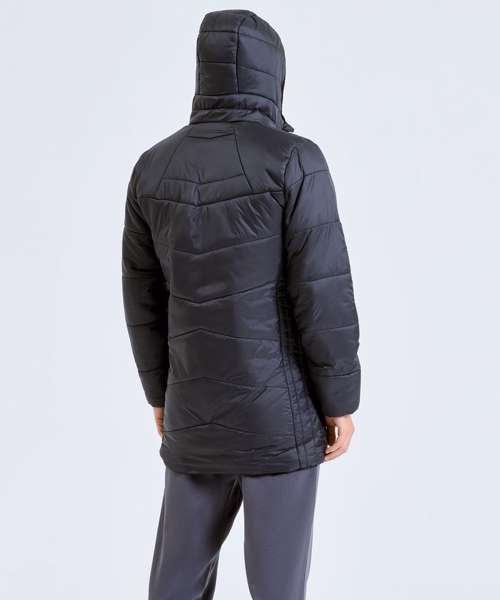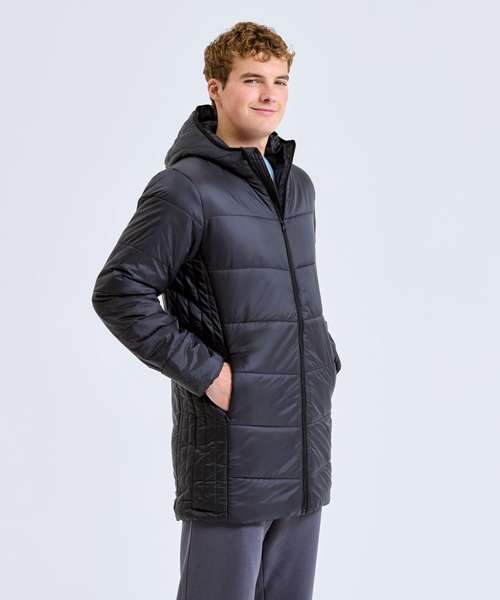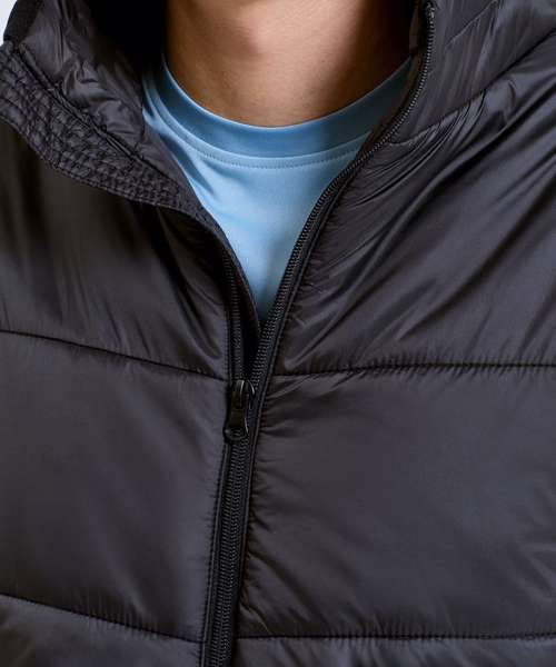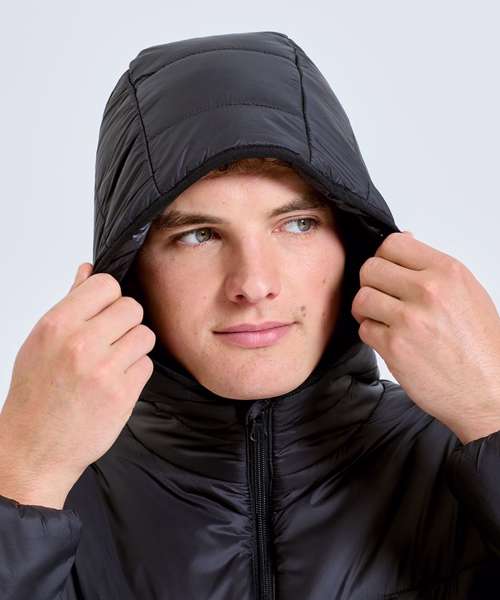 Lightweight mid-length padded jacket with diagonal quilting to centre front and back for a flattering fit. Vertical quilting side panels to body and horizontal quilting to arms. Full zip-through style with hood. Panel detailing to hood with elasticated finish for a snug fit. Internal storm flap. Zipped side pockets. Two concealed inner pockets, one left chest for storing items like a mobile phone or keys. Elasticated cuffs. Packable bag included for handy storage of jacket when not in use. We recommend using block out vinyl and inks.Product contains no branded neck or waist label. Removable Kimble or looped garment tags. Inner seam label holds important product information on one label with a second label containing brand information which can be cut-away.