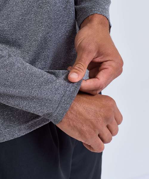 Contrast ¼ zip. Long sleeves. Stretch. Twin-needle stitching. Wicking fabric. We recommend using block out vinyl and inks.Product contains no branded neck or waist label. Removable Kimble or looped garment tags. Inner seam label holds important product information on one label with a second label containing brand information which can be cut-away. UPF 40+.