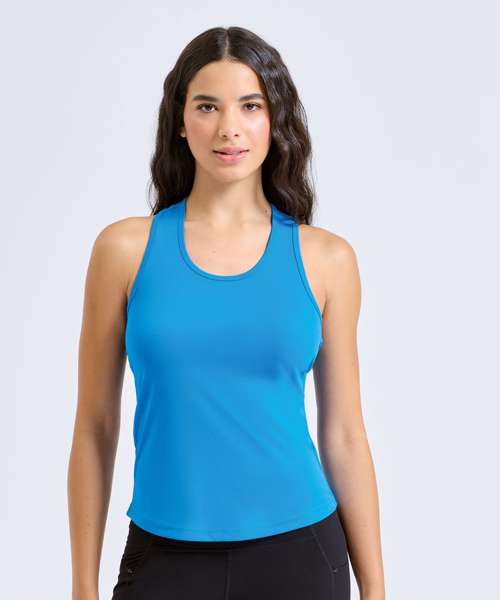 Scoop neck. Racerback. Curved hem. Recycled polyester. We recommend using block out vinyl and inks.Product contains no branded neck or waist label. Removable Kimble or looped garment tags. Inner seam label holds important product information on one label with a second label containing brand information which can be cut-away.