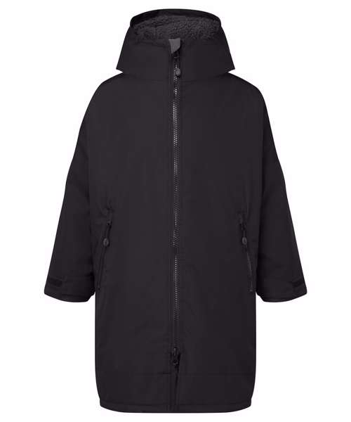 Unisex. Oversized. Full-length two-way plastic zip with easy pull toggles. Chin guard. Oversized fit. Side vents. Adjustable cuffs with hook and loop fastening. Side zip pockets. Inside pocket with zip on the left side. Inside patch pocket on the right side. 3-panelled hood. Loop on the centre back of the jacket for hanging the robe. Dropped back hemline. (5000/5000 waterproof and windproof). Embroidery access to the back and chest area can be accessed through here. Waterproof taped seamed outer layer. Sherpa fleece interior. Rebrandable stuff sack carry bag with double drawstring straps. CE Class 1 Certified.