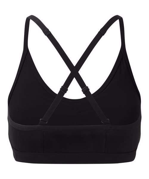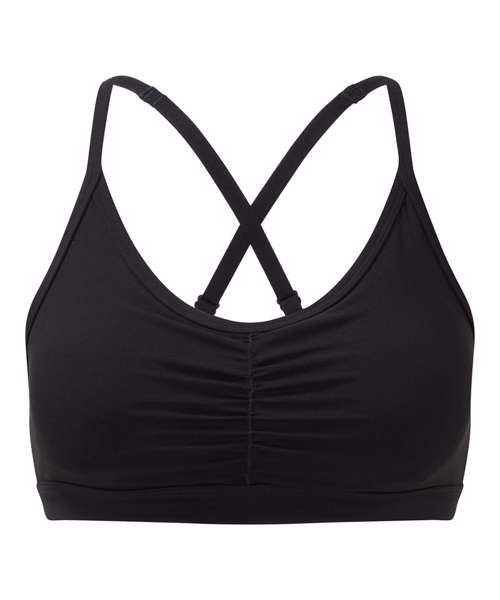 Medium-impact sports bra. Elasticated under bust for added support. Ruched detailing to centre front. Cross back straps with adjusters. Removable padding inner. Panel detailing to back with mesh detail centre. We recommend using block out vinyl and inks.Product contains no branded neck or waist label. Removable Kimble or looped garment tags. Inner seam label holds important product information on one label with a second label containing brand information which can be cut-away.